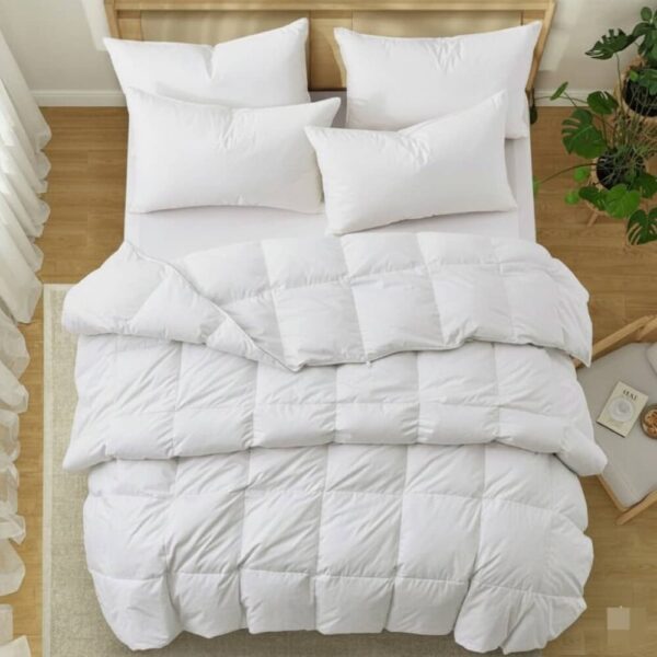 يتكون من قماش قطن 100% مستورد حشو بولي داون ، مما يوفر الراحة والتهوية ,حشو البولي داون يتميز بالنعومة الفائقة ليعطي إحساسًا مشابهًا ب الريش الطبيعي. يتمتع بوزن خفيف وتدفئة مرتفعة، كما أنه سريع الجفاف ويتطلب الحد الأدنى من الكي. القماش الخارجي مصنوع من قطن فائق الجودة.
