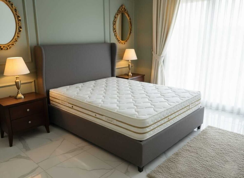 Life Mattress continuous spring mattress offers strong and balanced support thanks to its rust-resistant steel frame and high-density foam layers. It features a luxurious design with ventilation openings and side handles, making it perfect for healthy sleep and long-lasting comfort at an economical price.
